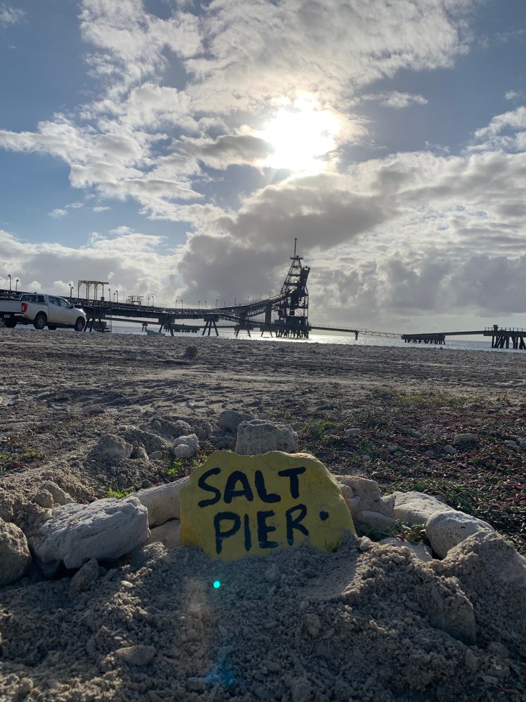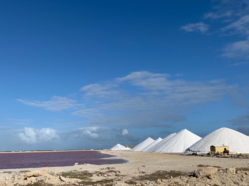There are several enormous shallow salt pens on the opposite side of the road to the salt pier. The water evaporates and the resulting salt is piled up in huge salt mountains. Theres a small “railroad” from these to the end of the salt pier where salt is loaded up to large cargo ships to be exported. The water in some of these shallow pens is purplish pink and the flamingos eat the shellfish living there. Our running route comes past these, and when its windy (as it usually is here) salt foam fills the air and blows over the road from the salt pens.