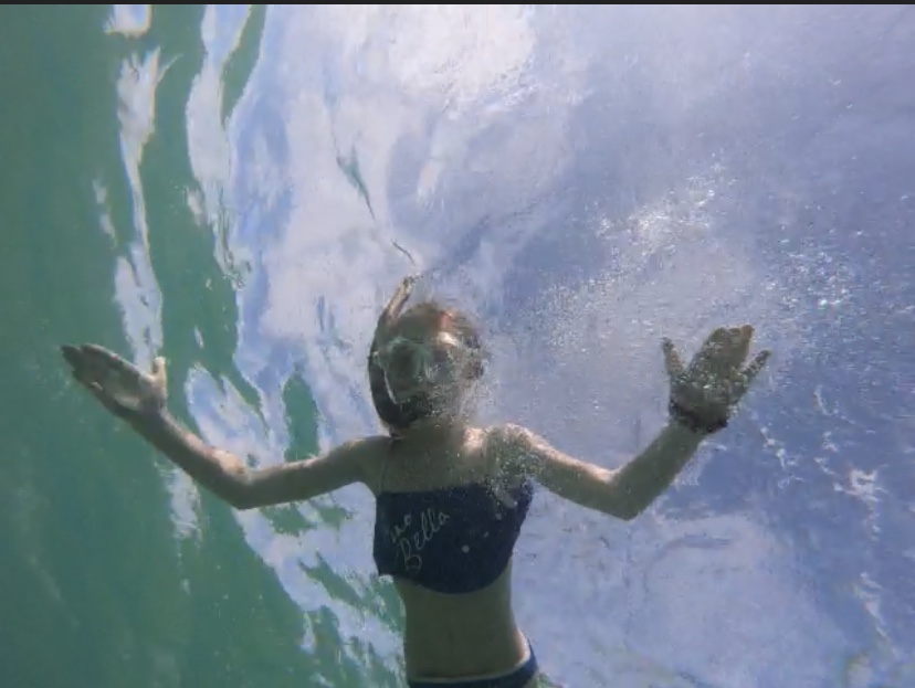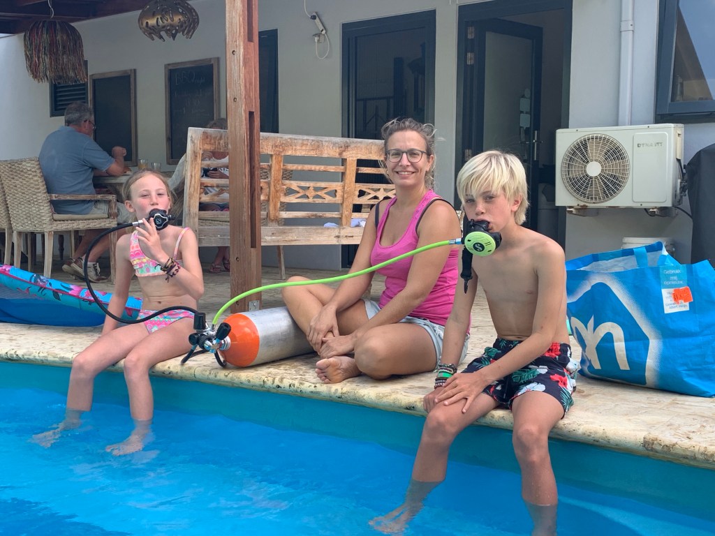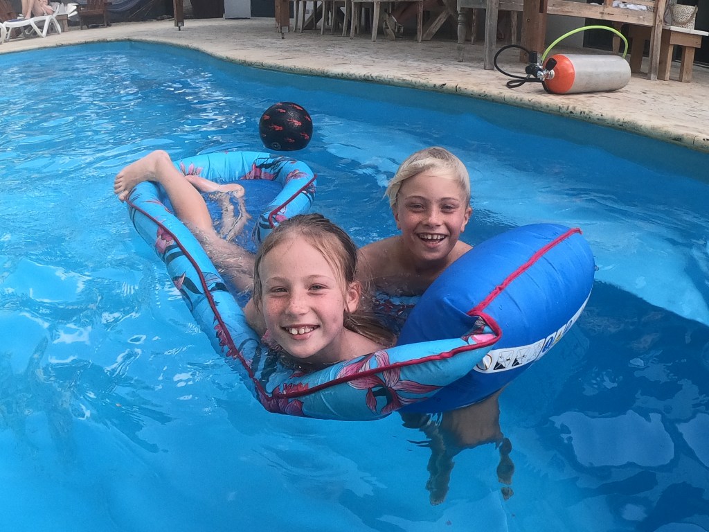 Too much of something isn’t always good… Mille has been very patient with the rest of the windsurf-crazy family. She’s been reading (all the) books she brought from home (thanks to Farmor we have a kindle and are able to download several books there) whilst waiting for us being thrown around by the wind in the lagoon. (Well, in all honesty it is me who has been thrown round by the wind, Erik and Noah have really gotten the hang of surfing – they look like real surfdudes out there). Noah and Mille got a hoodie each from the surf city boss lady as a holidaypresent, because she loved the way they looked in the jackets . Anyway, after having lunch at the well renown “kite city food truck” (you can find it in the Trip advisor too!) on Te Amo beach (yes, right next to the cool, but unhandy foodpoisonbus!), we took Erik back to the surf place and then the three of us went back to the guesthouse to chill by the pool. We met Kim, who was folding the bedding for changing in our room, and Mille had a long conversation with her, where she explained how fed up she was of the surf beach(quite understandable). Some of the other guests staying here went by and told us they were going diving. Mille had a million questions about this, being our HMS-boss (can the tank explode? is it dangerous? are there whales here?How about sharks?). As it turns out, Kim is a diving instructor, both for children and adults, so she came out to the pool in her swimwear with an oxygen tank with 2 nozzles and a mask, and she took the children through the breathing routine and went in the water with them for an hour where they played around in their masks with the O2 nozzles. Needless to say, she’s by far the childrens star of the stay! They loved it!