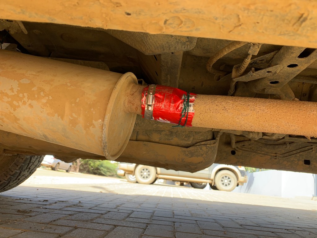 Thinking outside the box – during our stay here we’ve gotten around with a Toyota Hilux. It has made quite a lot of noise, but as I picked up Erik from his solo surfing one afternoon the sound rised to a roar and then there was a “clang”…. I stopped the car to find the muffler hanging down underneath it. Luckily the back hatch of the Hilux is defect so it was held together by a long belt. We crawled under the car and fastened the belt around the muffler and two the one side of the car, Erik got into the back and held on to the other belt end and we got the car and the muffler home. As we are on an island, getting new parts for a car isn’t the same as back home, but a Coca Cola can with top and bottom removed works perfectly, and now the car runs smoothly, just making a little sound when changing between 1st and 2nd gear! The Hilux is therefore now renamed “the Coca Cola car”!