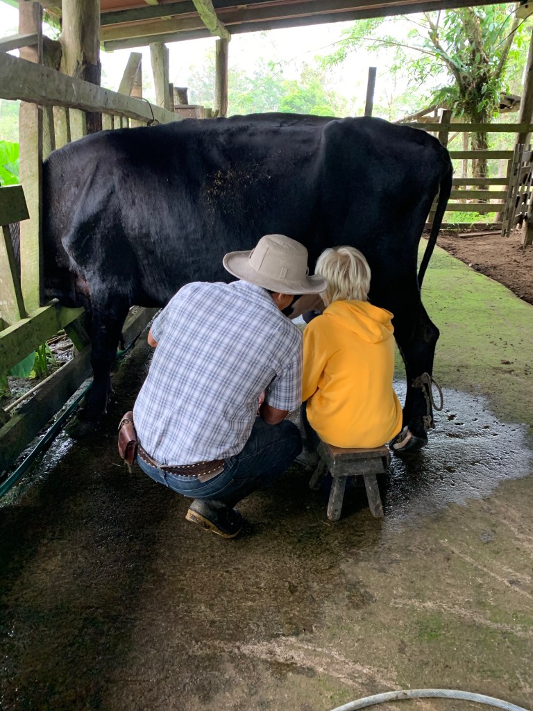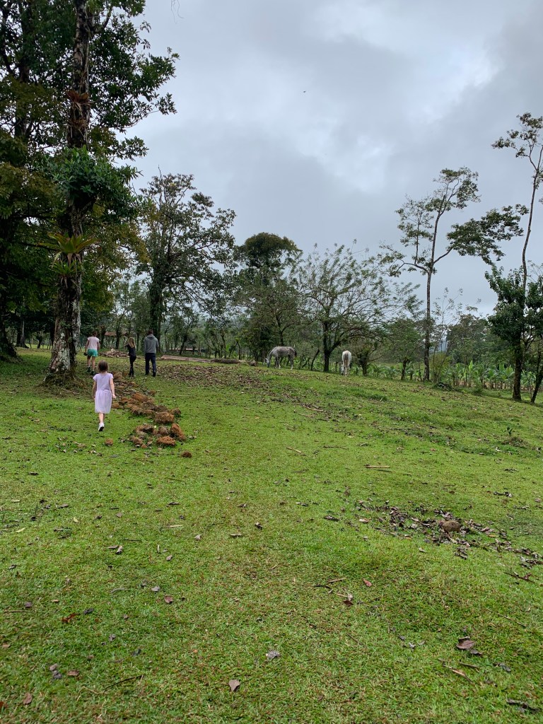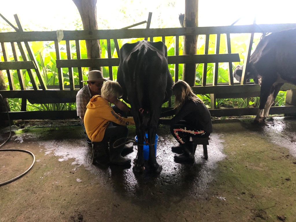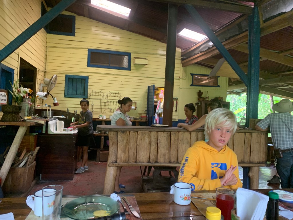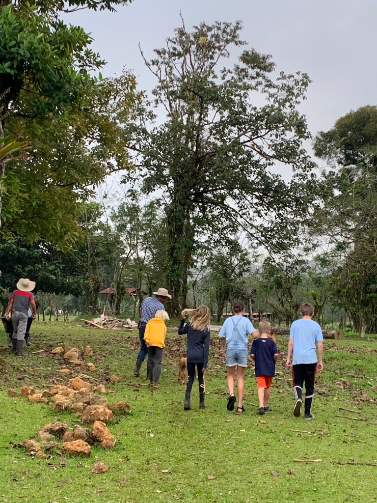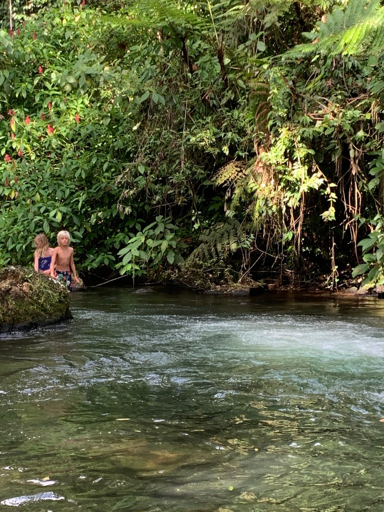 Earlybirds walking up the pastures at 7 in the morning with home made hot chocolate to milk the cows, greet&cuddle the chickens and say hi to the pigs, followed by home made breakfast, best ever coffee served in metal cups and home made, wood fired stone oven baked bread. A time to teach the children where our food really comes from. Meat, eggs and milk here comes from the animals living here. The fruit, veggie, chocolate and coffee is from local farmers. Its a fact that a fair amount of Costa Ricans are self preserved when it comes to a lot of food like meat, fruit and vegetables. Many children nowadays grow up thinking meat arrives in the world vacuum packed… We met the sweetest boy, Ryder of about 12-13 y.o. who was at the lodge with his parents. The second morning he came along up to milk cows and say hi to the pigs together with Mille and the other kids. Mille had just gotten to know that all the meat we ate at lunch and dinnertime at the lodge came from the lodge`s own pigs, chickens and cows, and she was really bummed. Ryder caught on to that Mille was a little overwhelmed with the new information, and I overheard him trying to comfort her. Children are so insightful, and some children are especially gentle and kind; He told her that “I understand that you think that it feels sad that we eat these animals. But, you know, Alejandro and the other staff wash, feed and treat the pigs (and the other animals) here really well, and they live maybe 5-6 really good years, which is like a whole lifetime for a person. Then when the time comes, the animals give us meat so that we can grow and live and enjoy good food and lives. So, its like we give them a good life – and they give us something good and important back.” He chatted with her the whole way back to the lodge, and because of the way he explained things, not only did Mille understand it, but it left her with a greater acceptance of the inevitable circle of life. Here too we made friends for life, as Miss Garland and her 3 beautiful children of approximately the same age as Mille and Noah happened to arrive the same day as we came. So we all had someone to hang out with the days we spent there, which made the whole experience even more special.