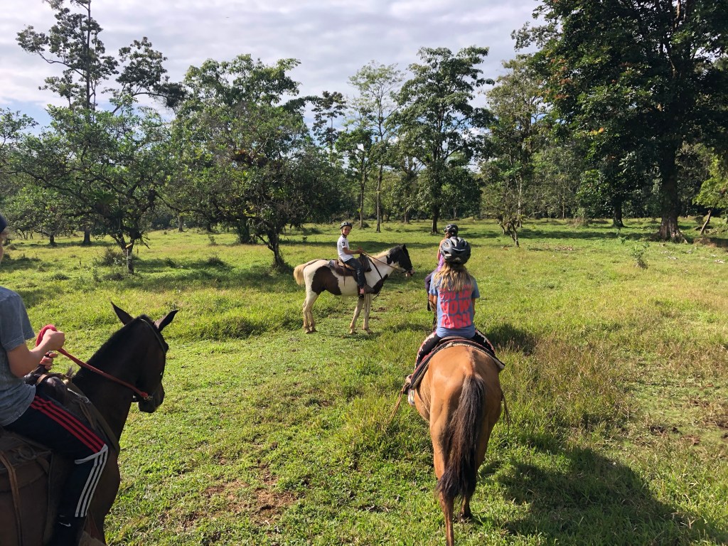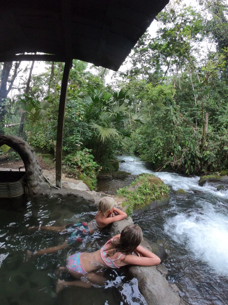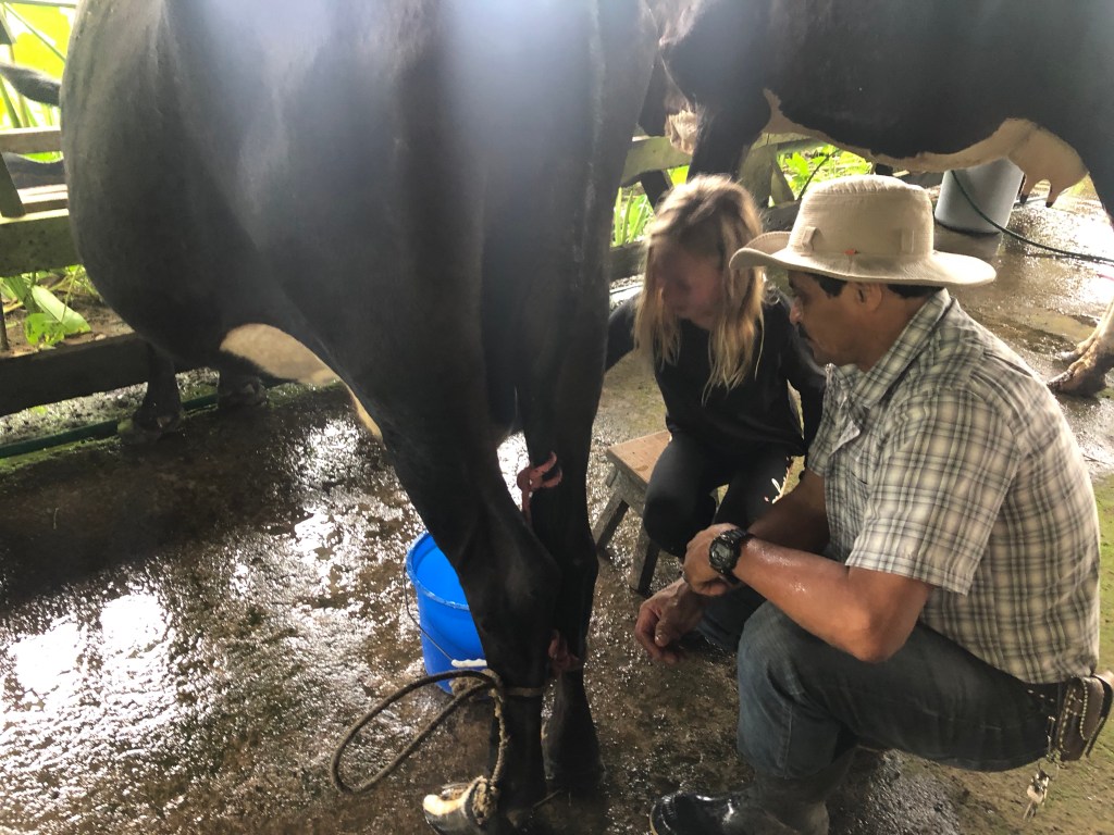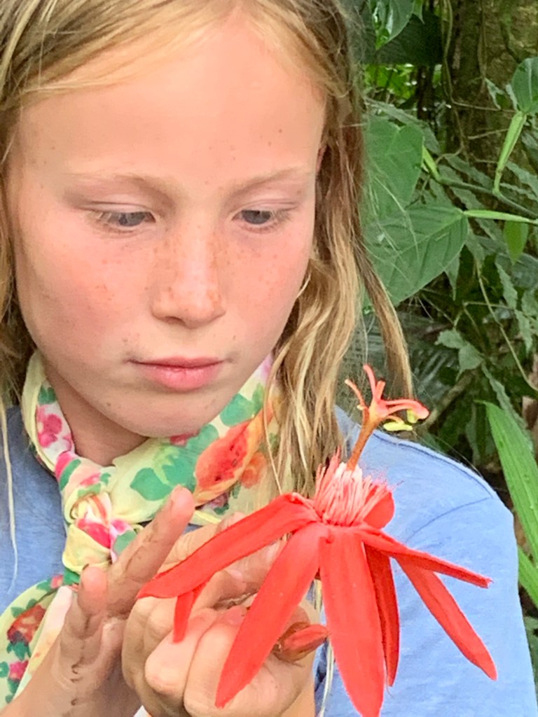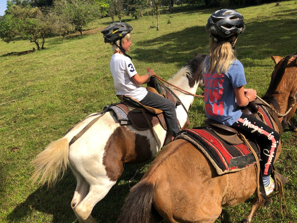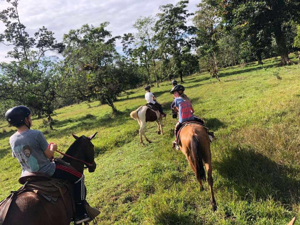 Earlybirds walking up the pastures at 7 in the morning with home made hot chocolate to milk the cows, greet&cuddle the chickens and say hi to the pigs, followed by home made breakfast, best ever coffee served in metal cups and home made, wood fired stone oven baked bread. A time to teach the children where our food really comes from. Meat, eggs and milk here comes from the animals living here. The fruit, veggie, chocolate and coffee is from local farmers. Its a fact that a fair amount of Costa Ricans are self preserved when it comes to a lot of food like meat, fruit and vegetables. Many children nowadays grow up thinking meat arrives in the world vacuum packed… We met the sweetest boy, Ryder of about 12-13 y.o. who was at the lodge with his parents. The second morning he came along up to milk cows and say hi to the pigs together with Mille and the other kids. Mille had just gotten to know that all the meat we ate at lunch and dinnertime at the lodge came from the lodge`s own pigs, chickens and cows, and she was really bummed. Ryder caught on to that Mille was a little overwhelmed with the new information, and I overheard him trying to comfort her. Children are so insightful, and some children are especially gentle and kind; He told her that “I understand that you think that it feels sad that we eat these animals. But, you know, Alejandro and the other staff wash, feed and treat the pigs (and the other animals) here really well, and they live maybe 5-6 really good years, which is like a whole lifetime for a person. Then when the time comes, the animals give us meat so that we can grow and live and enjoy good food and lives. So, its like we give them a good life – and they give us something good and important back.” He chatted with her the whole way back to the lodge, and because of the way he explained things, not only did Mille understand it, but it left her with a greater acceptance of the inevitable circle of life. Here too we made friends for life, as Miss Garland and her 3 beautiful children of approximately the same age as Mille and Noah happened to arrive the same day as we came. So we all had someone to hang out with the days we spent there, which made the whole experience even more special.