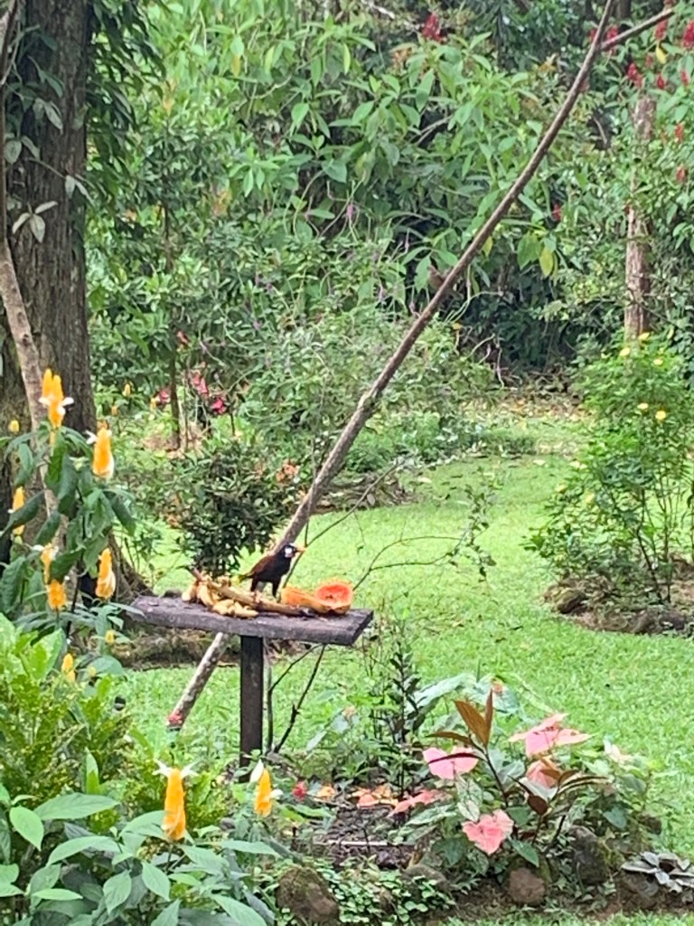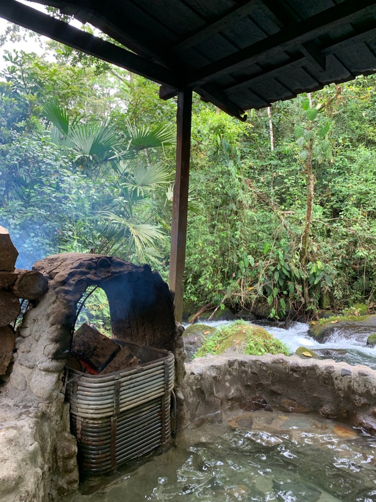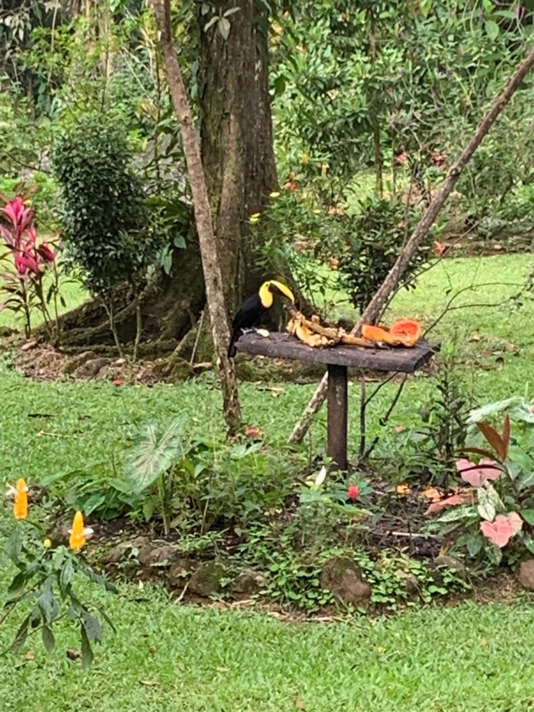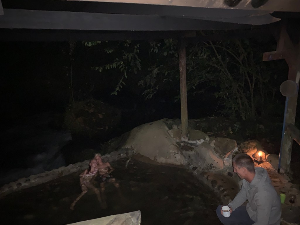 Jungle paradise on earth – La Carolina Lodge (March 3rd-5th), on the eastern slopes of Volcano Tenorio. In leaving Funky Monkey Lodge and running into a road jam on the mountain pass (!) we suddenly found ourselves in the midst of the jungle after a 4 hr (rather bumpy and dusty) ride. The temperature had dropped about 10 degrees, so to about 25 degrees celsius – actually felt cool on the skin compared to (the lovely)burning CR sun on the beach! Upon our arrival, getting out of the car was like entering a sound-machine on full power. The sound of the jungle with birds, insects and animals making so much noise together with the close by river – and it is never-ending! We went to bed to the sounds and woke up to them, it just felt like our senses were on high alert! The moist jungle scents, the coffee brewed the old fashioned way on a wood-fired stove, the smell of burning firewood from the wood fired hot tub and the 2 fireplaces lit morning and evening and home cooked food. There are just a few electric lights, otherwise the paths, eating areas, resting areas and hot tub are lit by wax candles every evening. No need to use the locks the doors but mosquito nets encasing our beds and the bedroom filled with jungle air at night through open window covered by nets. Just stopping by the lovely Tico ladies in the kitchen whenever there was want or need for fresh brewed coffee, tea, freshly pressed juices or hot chocolate. Set times for breakfast, lunch and dinner – together with the rest of the guests. But it never felt crowded – we just felt extremely taken care of and pampered in every possible way. The only way to make contact with the outside world (which we really didn’t feel the need or want for here) was to wander over to the main reception area, and sit down in one of the leather chairs (close by the Hummingbird garden where there was a miniature Hummingbird nest with 3 Hummingbird-babies).
