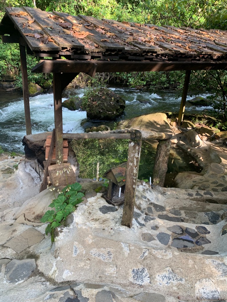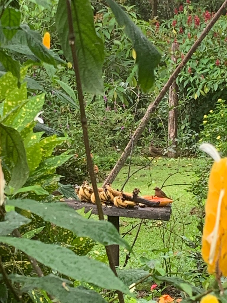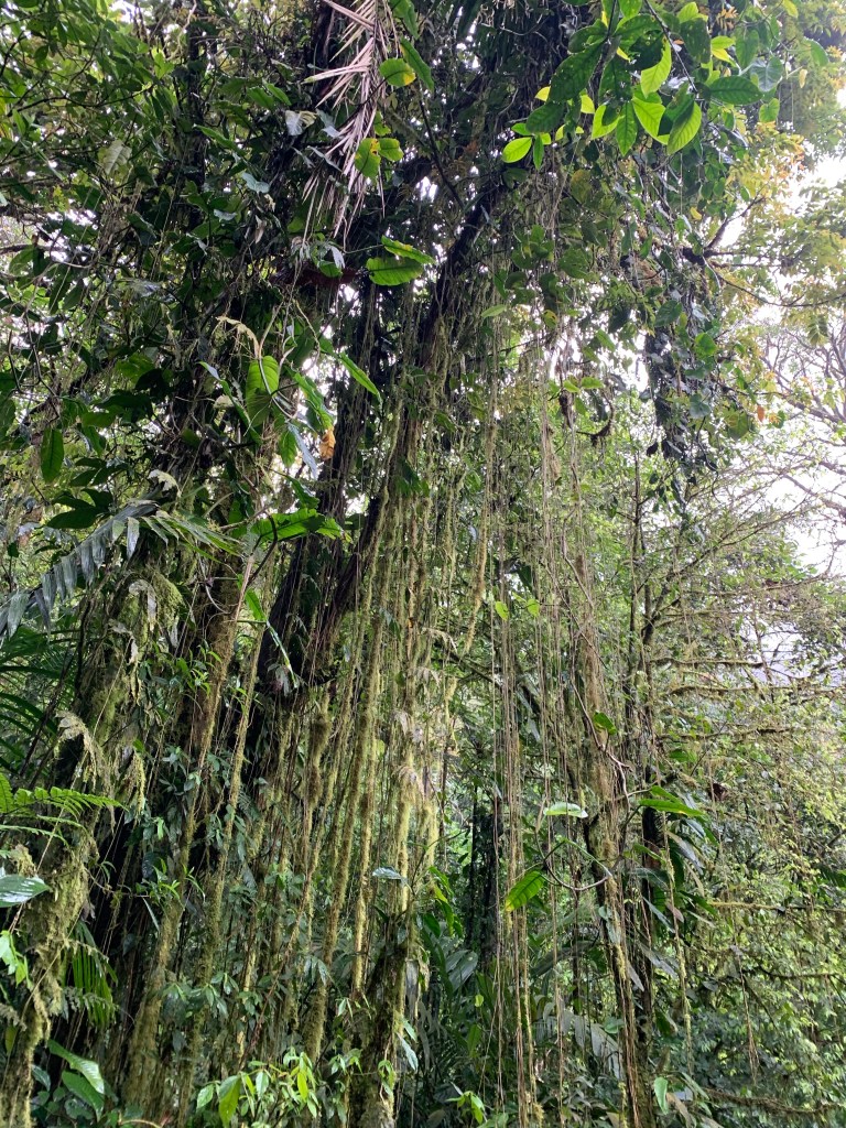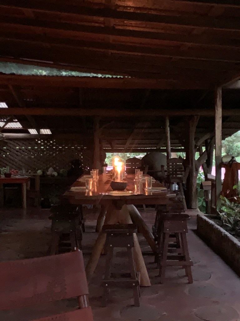 Jungle paradise on earth – La Carolina Lodge (March 3rd-5th), on the eastern slopes of Volcano Tenorio. In leaving Funky Monkey Lodge and running into a road jam on the mountain pass (!) we suddenly found ourselves in the midst of the jungle after a 4 hr (rather bumpy and dusty) ride. The temperature had dropped about 10 degrees, so to about 25 degrees celsius – actually felt cool on the skin compared to (the lovely)burning CR sun on the beach! Upon our arrival, getting out of the car was like entering a sound-machine on full power. The sound of the jungle with birds, insects and animals making so much noise together with the close by river – and it is never-ending! We went to bed to the sounds and woke up to them, it just felt like our senses were on high alert! The moist jungle scents, the coffee brewed the old fashioned way on a wood-fired stove, the smell of burning firewood from the wood fired hot tub and the 2 fireplaces lit morning and evening and home cooked food. There are just a few electric lights, otherwise the paths, eating areas, resting areas and hot tub are lit by wax candles every evening. No need to use the locks the doors but mosquito nets encasing our beds and the bedroom filled with jungle air at night through open window covered by nets. Just stopping by the lovely Tico ladies in the kitchen whenever there was want or need for fresh brewed coffee, tea, freshly pressed juices or hot chocolate. Set times for breakfast, lunch and dinner – together with the rest of the guests. But it never felt crowded – we just felt extremely taken care of and pampered in every possible way. The only way to make contact with the outside world (which we really didn’t feel the need or want for here) was to wander over to the main reception area, and sit down in one of the leather chairs (close by the Hummingbird garden where there was a miniature Hummingbird nest with 3 Hummingbird-babies).