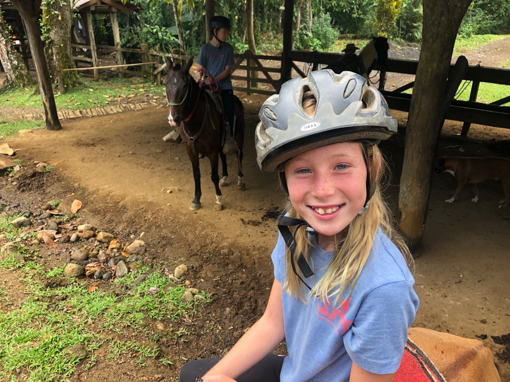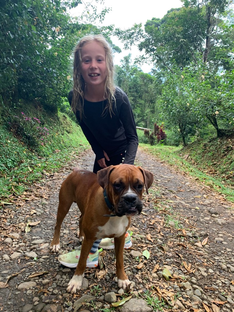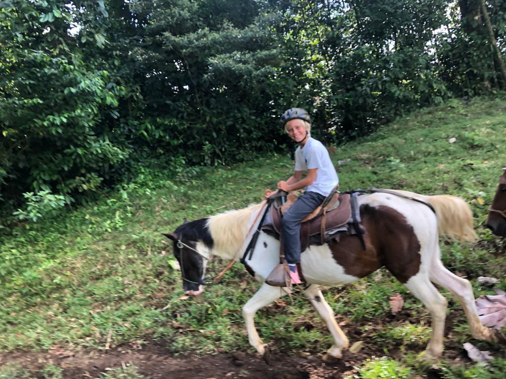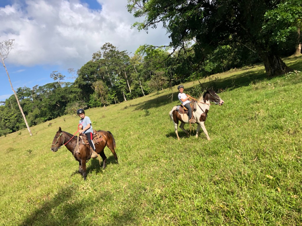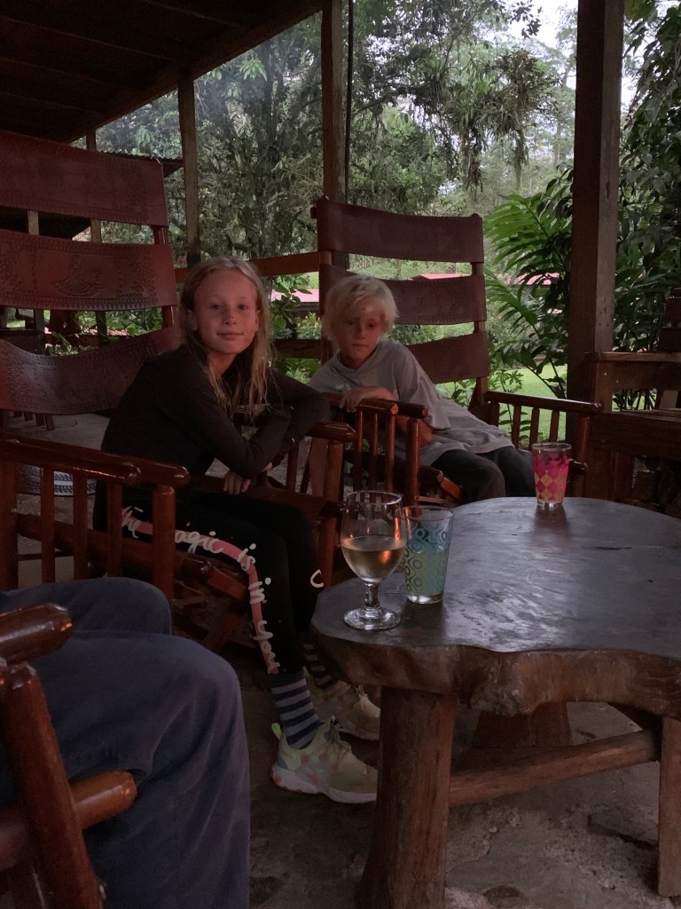 Warm hearted – Costa Ricans are – just like most latinos – exceptionally good and welcoming with children. The staff at La Carolina Lodge were no exception to this – feeding the children hot chocolate, Alejandro taking them horseback riding, milking cows & petting little chicklets, handing them homemade cheese cut into cubes for fish bait to fish in the river and showing the kids Sloths, birds and telling them all about nature, animals and plants all around. The age limit to go horseback riding there is 10 years, so then Alejandro take the smaller kids for a short loop on horseback in the back yard instead, just so they can also get the experience. The 2 cute, young boxers that belong to the owners tag along for everything from milking, to horseback riding, to just cuddling up when evening comes by your leg by the fireplace.