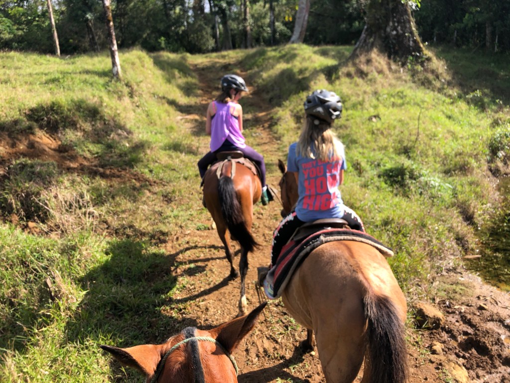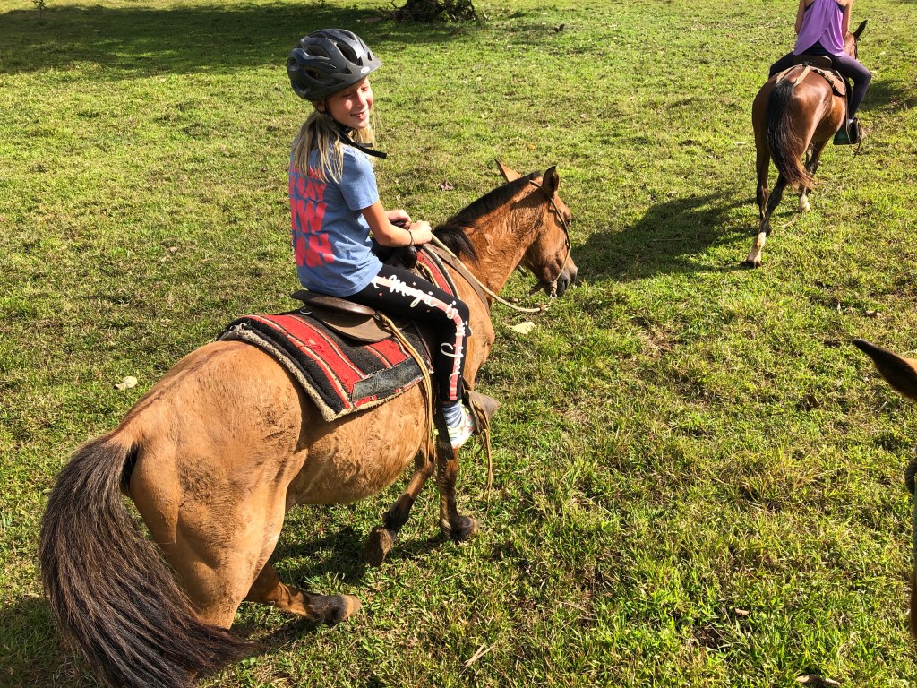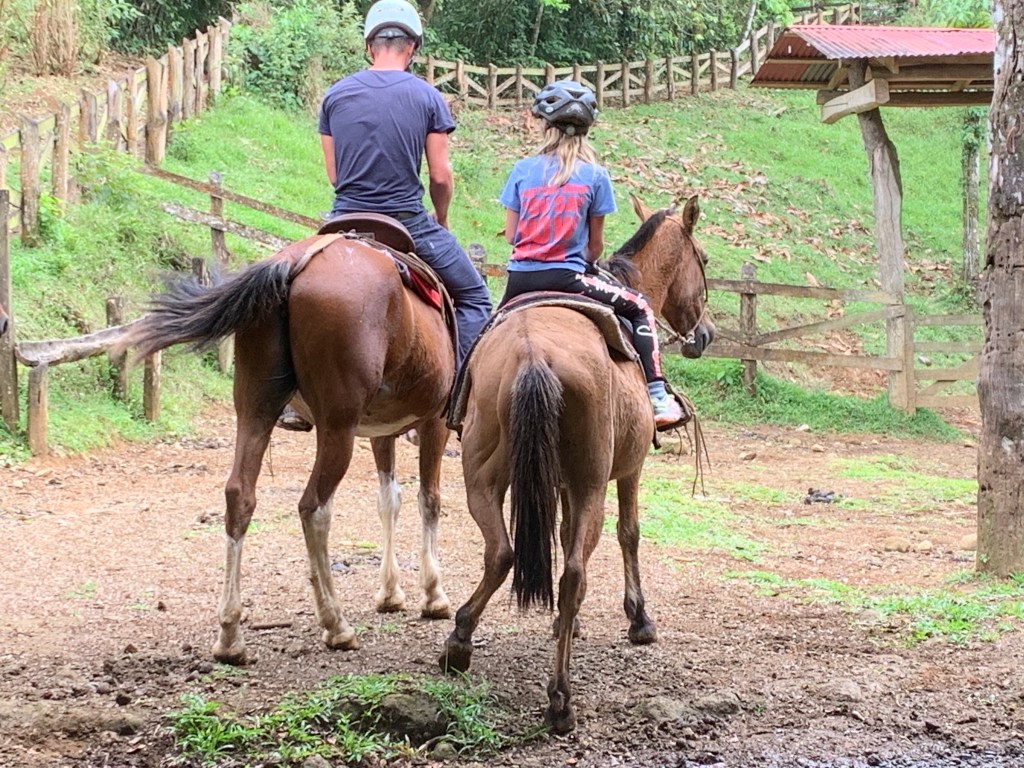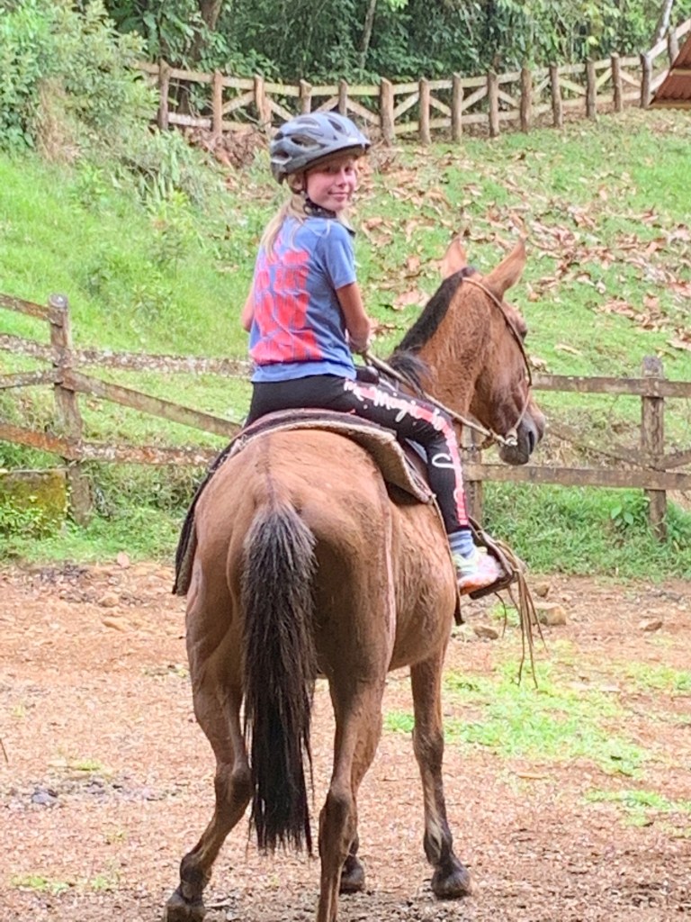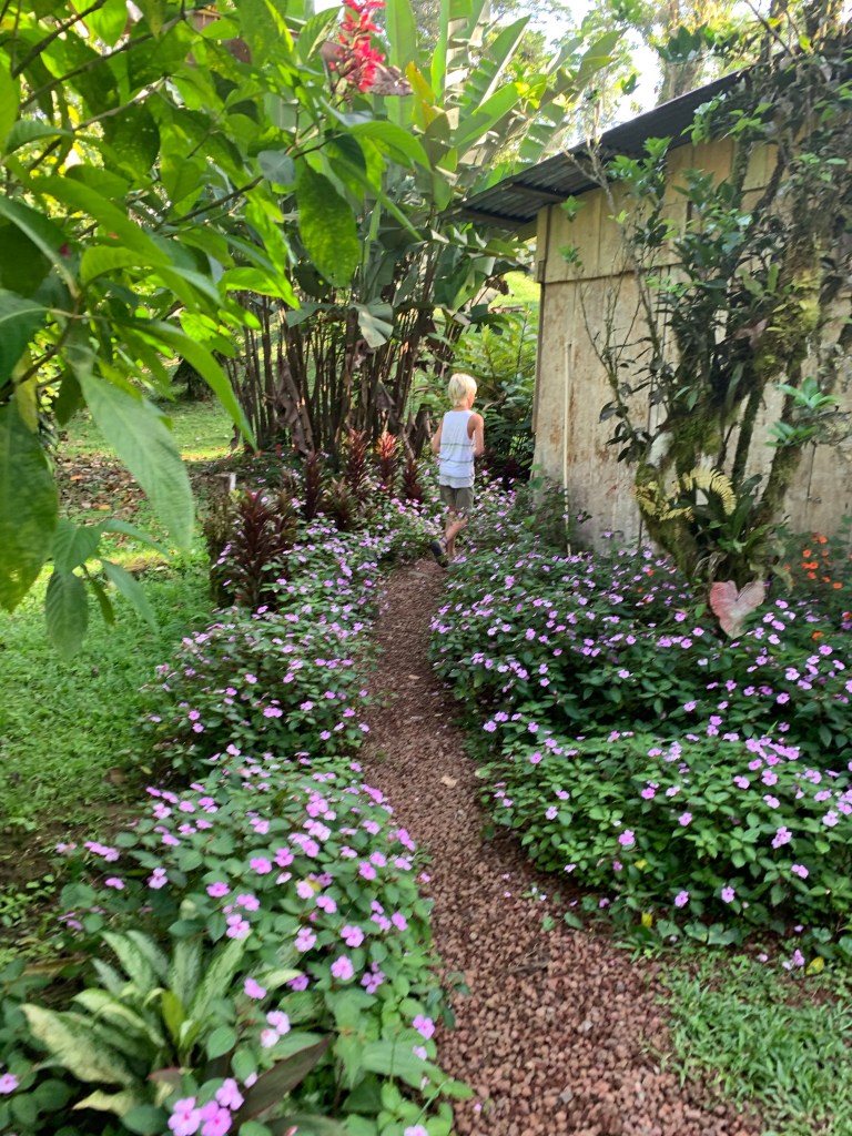 Warm hearted – Costa Ricans are – just like most latinos – exceptionally good and welcoming with children. The staff at La Carolina Lodge were no exception to this – feeding the children hot chocolate, Alejandro taking them horseback riding, milking cows & petting little chicklets, handing them homemade cheese cut into cubes for fish bait to fish in the river and showing the kids Sloths, birds and telling them all about nature, animals and plants all around. The age limit to go horseback riding there is 10 years, so then Alejandro take the smaller kids for a short loop on horseback in the back yard instead, just so they can also get the experience. The 2 cute, young boxers that belong to the owners tag along for everything from milking, to horseback riding, to just cuddling up when evening comes by your leg by the fireplace.