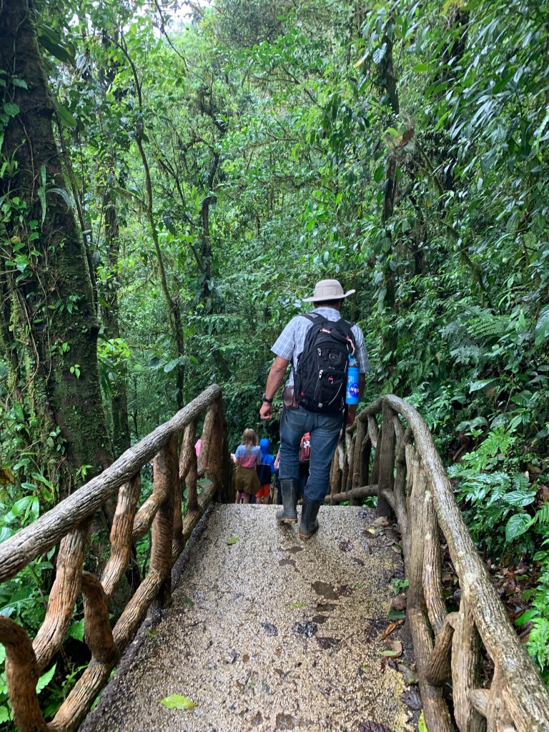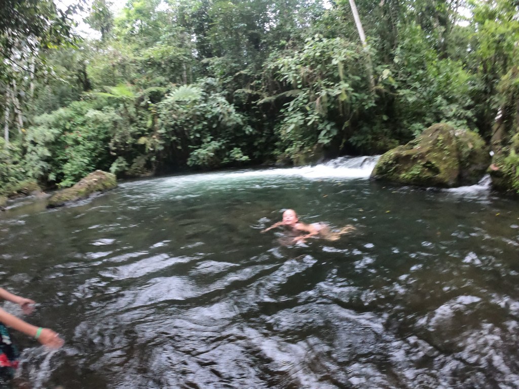 Arriving at the waterfall – The waters colour is an astonishing deep turquoise, owing to a phenomenon known as Mie scattering; When the Buenavista river upstream with its aluminium and silicon particles meets the Sour Creek with its acidic waters, the resulting interaction causes the suspended particles in the Rio Celeste to scatter light, thus creating the turquoise colour. The walk goes further up the river, to the place where the two rivers meet and the color appear, but by then the children were wet and tired, and even though I really used all my convincing powers there was no way I was winning the battle of having them walk for another 2,5 hours in the pouring rain… Oh well, I guess that just means I have to go back, with the bonus of being able to once again stay at La Carolina Lodge!