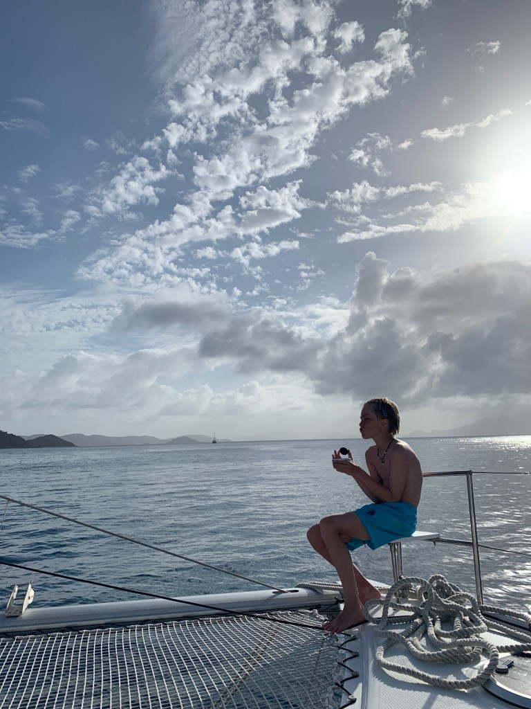 In plain view of the guests of Omars fusion restaurant the 4 adults with Erik at the ships wheel maneuvered our 41ft large cat out of the harbour with great elegance avoiding all the multibillion vessels located all around us and then we headed directly to Cane Garden Bay(West Tortola)to pick up our first Mooring for the first time out at sea.