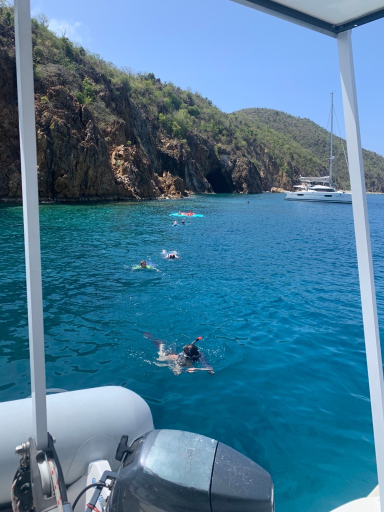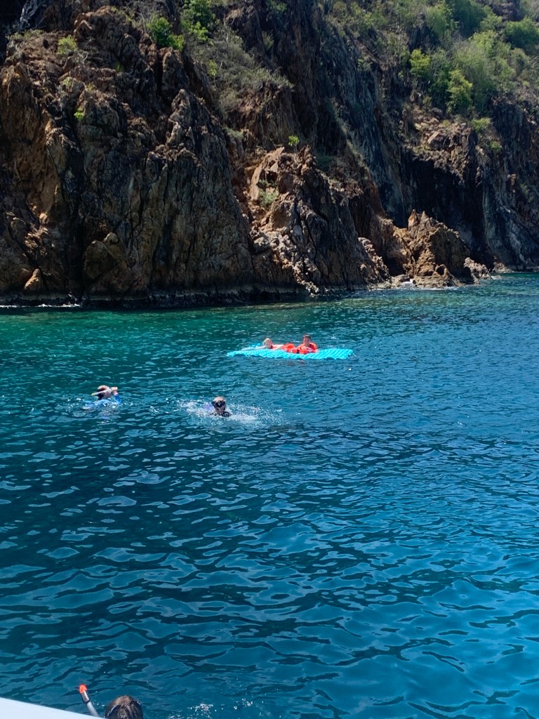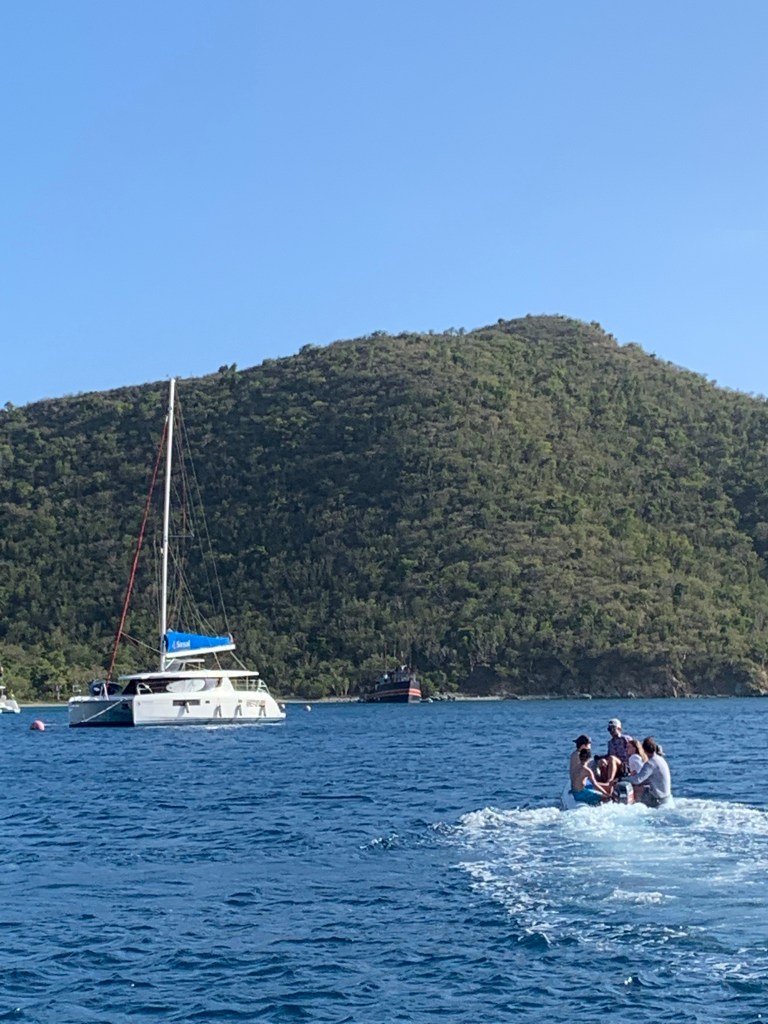 The final destination for the day and mooring Dock for the night ; Pirates Bight , Norman Island. here they have the coolest ship bar/restaurant Willy Ts with its own 3,5 m jumptower where Millie jumped off doing a backflip, leaving the three guys gobsmacked in her wake💪🏻. Willy T (William Thornton) is a converted tanker named after the architect of the US Capitol building. The original was lost in the hurricane Irma which is now a man made reef. Norman Island is referred to by locals as Treasure Island due to legend stories of lots of buried pirate treasures….