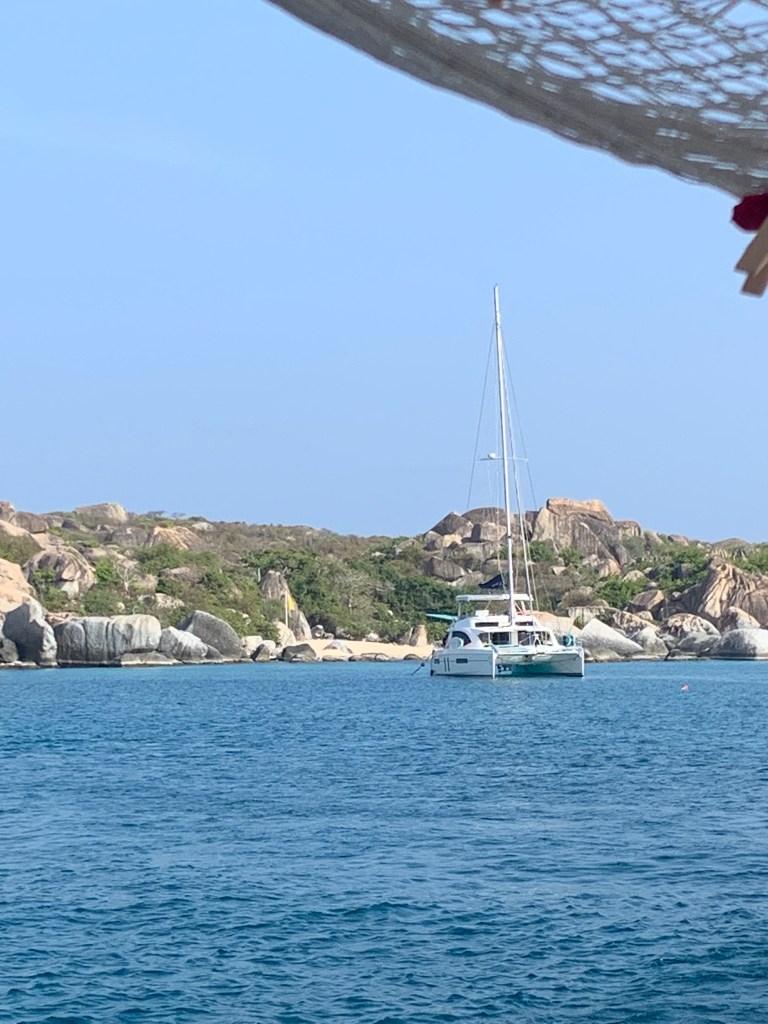 After a nice long morning lay-down on Cooper Island beach with coldbrewed ice coffees and some quality reading/free wifi-time, we turned our boats nose toward Virgin Gorda (the fat Virgin, named after the shape of the Island). Nice head winds so we got up both the Genoa and the main sail, and got the feeling of real sailing with the Cat! There is no way to describe the power that you feel when only the sails and wind take you forward- both exhilarating and terrifying at the same time, leaving you quite lightheaded in the beginning before you realise that you will not die, and that the boat is quite stable!(not saying that all aboard this boat had this feeling…)!