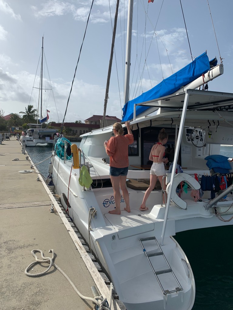we all got ready with the ropes and bumpers ready on deck and we tried to notify the Dockmaster on the radio channel 16/74: «Dockmaster, Dockmaster, this is Double trouble, we are approaching Spanish Town Harbor with our portside engine down and need assistance!» but alas, there was only a sound of silence… we tried several times, but up on cloud nine somebody was clearly awake, and so was a couple of all american and all Australian sailors docked right by us om their own moorings, so before we knew it Mr America had his dinghy lodged on our port side back of the boat and Mr Australia had his dinghy tied up to our Starboard front and with these two, our two captains and Double troubles own two ladies, we got DT safely to port after what seemed like nervewrecking endless half hour! Just about more than enough exitement for one day(let alone for the whole trip I would say)! Thank goodness for the unspoken courtesy and genuine wish of strangers to help people in need at sea!