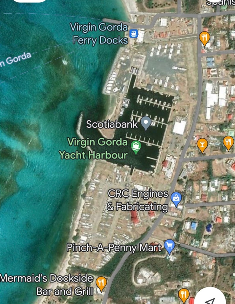 With the crew back on the boat after a short trip of bliss, we headed up to the moorings outside of Spanish town, at the Virgin Gorda Yacht harbour. We had noted that something wasnt sounding quite right with our port engine and it kept on sounding a loud alarm every time it was at low tripcount. So when we were all mooringed up, Capt Eriksen headed down in the port engine room with his head lamp and tools. with the hatch open we could se the whole engine Shake and jump, something quite clearly amiss and the dynamo and fan belt were not it the correct placing in relation to eachother so the batteries were not charging. But our fine captain did figure out what was wrong- the big bolt holding the motor together had broken in two, so there was no way of going further out to sea without getting that fixed! Robert the boat guy was informed, and the deal was to Get help at the docks inside the at the Virgin Gorda yacht harbour of Spanish town. Just after 6 am the next day we were up, to beat the morning wind and waves. Knowing we only had the Starboard engine and the dinghy to Get our 41ft catamaran of 1665kg safely through the narrow passage entry path that had a righthanded bend into the port(see the screenshot below)