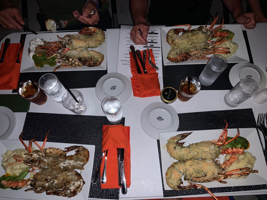 We managed to go by the food store Lil bits to stock up on what we needed just in time before they closed up and then headed over to the boat to Get all dressed up for our Anegada-good lobster dinner at The Wonky Dog. We ordered way more than we could eat but still we needed key lime pie and sticky toffee pudding for dessert, the whole evening was topped off with our own private beach disco with a DJ! The Double Trouble crew danced the evening away until the bitter end! The 8 of us stumbled into bed tummies full of lobster and feet knackered from dancing in the coral beach sand, humming the tune of YMCA.