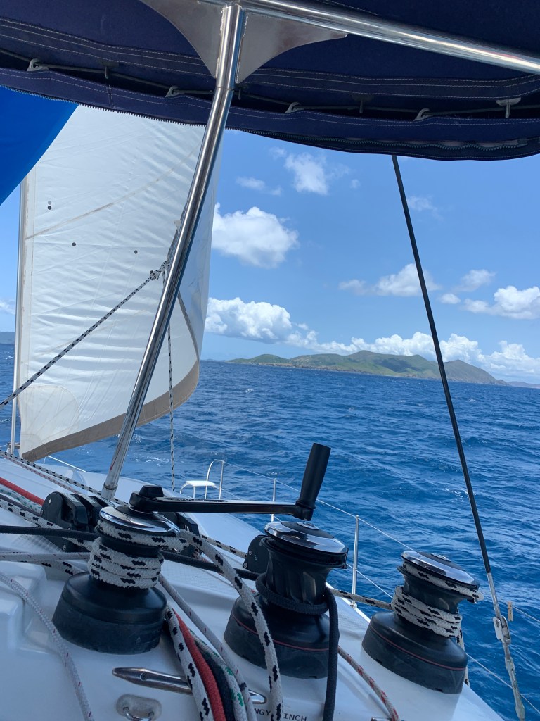 Early leaving from Anegada after bananabread and blueberry muffin delivery from Barry the mooring-guy, and the Bay turtle came up close to the boat as though to greet us «farewell and safe travels»!